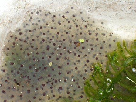 spring fed pond with large amounts of frog spawn which